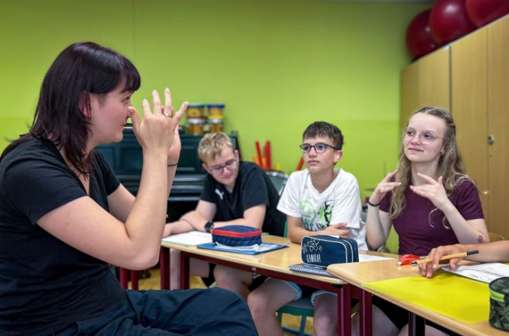 Luisa (rechts) gebärdet Songtexte im Chor "Happy Hands" für das Traumkonzert.