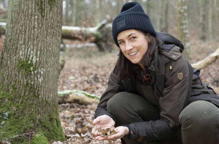 Gastgeberin Zaneta Frankenfeld zog 2018 mit ihrem Mann Johannes von Berlin in den kleinen Ort Sevenich in der Eifel. Dort haben sie den heimischen Wald als Nahrungsquelle für den Menschen wiederentdeckt. Unweit der Burg Eltz betreiben sie gemeinsam eine Bucheckern-Manufaktur. - Zaneta Frankenfeld sammelt Bucheckern im Wald.