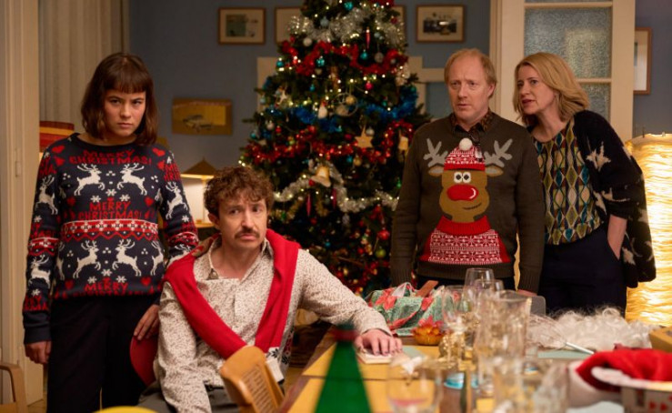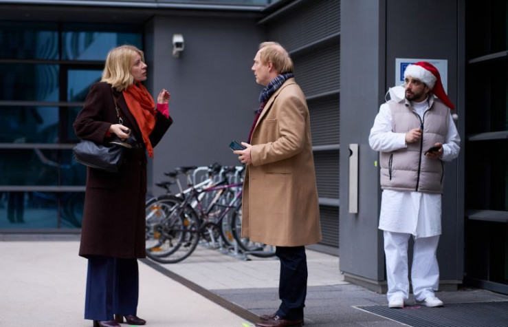 Von links: Sissy (Hilde Dalik) freut sich über die Ankunft von Weihnachtsmann" Peter. Harald (Simon Schwarz, MItte) und Till (Angelo Konzett) dagegen sind irritiert über dessen Aufzug.