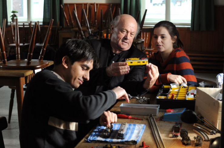 Amir tut die Ablenkung gut. Begeistert nimmt er die Lok unter die Lupe. Von links: Amir (Zejhun Demirov), Pfarrer Kurz (Hans Stadlbauer) und Charlie Keller (Marie-Claire Schuller).