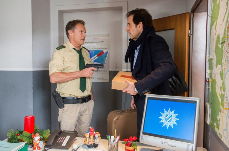 Das Wolfratshausener Revier feiert Weihnachten: v.l.n.r. Martin Riedl (Paul Sedlmeir), Franz Hubert (Christian Tramitz), Reimund Girwidz (Michael Brandner), Johannes Staller (Helmfried von Lüttichau), Lena Winter (Klara Deutschmann).