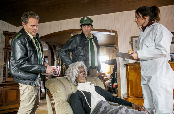 Hubert (Christian Tramitz, l.) und Staller (Helmfried von Lüttichau, r.) finden die Seniorin, die seit einem Jahr ihre Rundfunkgebühren nicht bezahlt hat, mumifiziert in einem Sessel sitzend und das schon seit geraumer Zeit. Die Pathologin Dr. Fuchs (Susu Padotzke, r.) geht zunächst von einem natürlichen Tod aus.