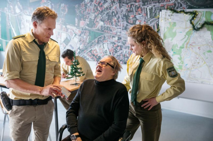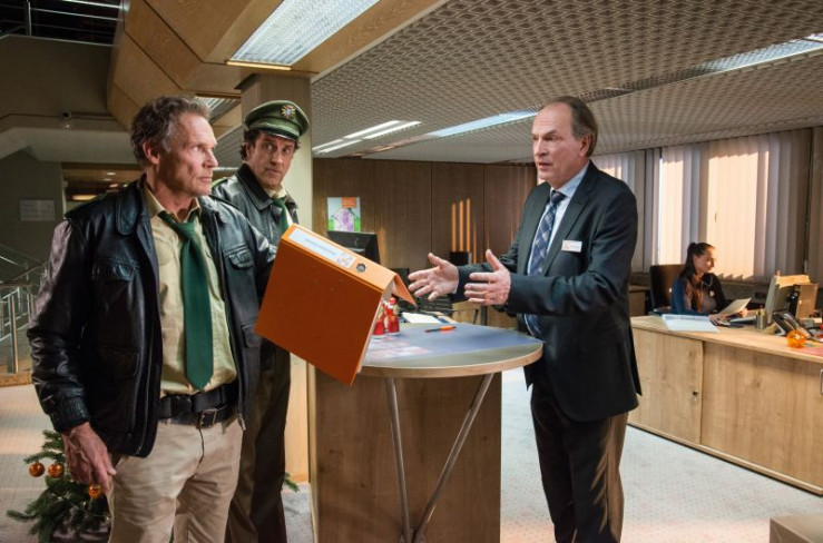 Hubert (Christian Tramitz, l.) und Lena Winter (Klara Deutschmann, r.) bereiten Girwidz (Michael Brandner, M.) auf seinen Undercover-Einsatz vor. Riedl (Paul Sedlmeir, im HG.)