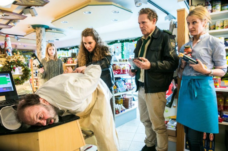 Lena setzt Metzger Schartl außer Gefecht. V.l.n.r. Anna (Sinje Irslinger), Metzger Schartl (Waldmar Kobus), Lena Winter (Klara Deutschmann), Hubert (Christian Tramitz), Barbara Hansen (Monika Gruber)