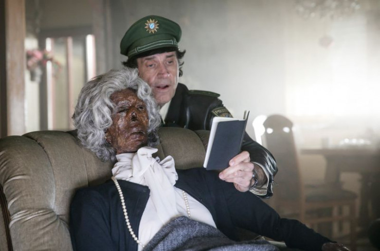 Hubert (Christian Tramitz, r.) und Staller (Helmfried von Lüttichau, l.) finden die Seniorin, die seit einem Jahr ihre Rundfunkgebühren nicht bezahlt hat, mumifiziert in einem Sessel sitzend und das schon seit geraumer Zeit.