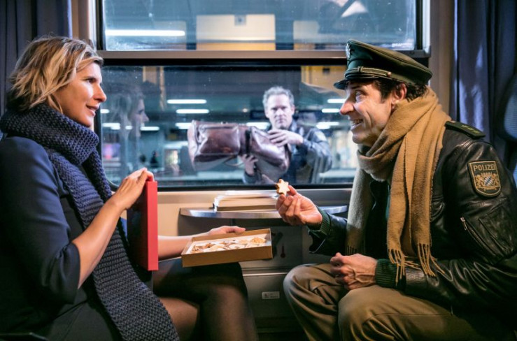 Staller (Helmfried von Lüttichau, r.) ist hingerissen von Sibille (Paula Paul, l.) und bemerkt nicht, dass er seine Tasche vergessen hat, mit der Hubert (Christian Tramitz, M.) draußen vor dem Zug steht.