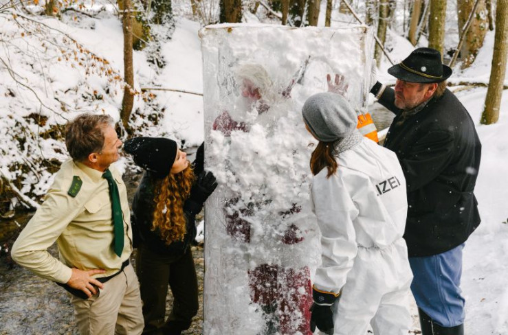 Der Eisblock macht die Untersuchung der Leiche zu einer Herausforderung. V.l.n.r. Hubert (Christian Tramitz), Lena Winter (Klara Deutschmann), Dr. Caroline Fuchs (Susu Padotzke), Bauer (Peter Rappenglück)