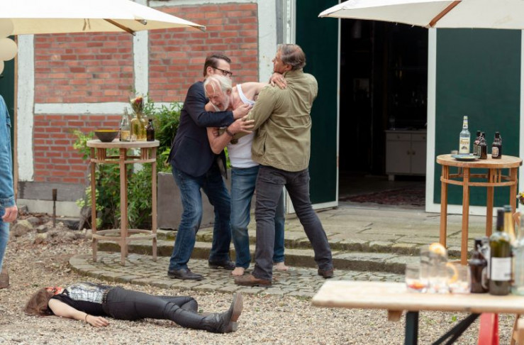 Joe Voss (Siemen Rühaak, M.) kann nicht fassen, dass seine Tochter Saskia (Nora Solcher, v.) tot ist. Lars (Ingo Naujoks, l.) und Finn (Sven Martinek, r.) versuchen, ihn zu beruhigen.