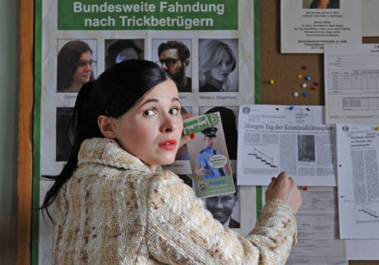 Katharina (Anna Fischer) verdeckt unauffällig ihr Foto auf dem Fahndungsplakat.