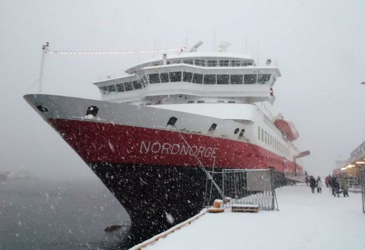 Hurtigruten-Schiff "Nordnorge" im Winter an der Pier.