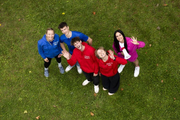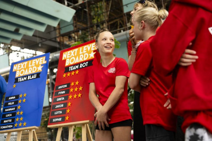 Drehstart für Deutschlands erste Kids-Reality mit Moderatorin Jessica Schöne (ob. Mi.) und prominenten Athlet:innen aus "Ninja Warrior Germany" (Melanie Schmidt, ob. 2.v.li., Ada Theilken, un.re., Lukas Homann, ob.li. und Moritz Hans, un. 3.v.re.)