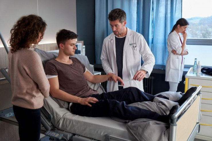 Alex Rode (Jan Hartmann) und Laura Seifert (Susan Hoecke) machen diverse Tests bei Fabian (Patrick Mölleken, sitzend). Der Nerv ist verletzt und die Reha wird ein Jahr dauern. Davon ist Julia (Muriel Wimmer, l.) geschockt.