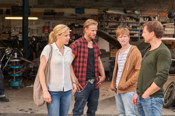 Stefan Vollmer (Hendrik Duryn, r.), Karin Noske (Jessica Ginkel) und Kevin (Moritz Klaus) besuchen Kevins Bruder Heiko (Frederic Heidorn, 2.v.l.) in der Werkstatt.
