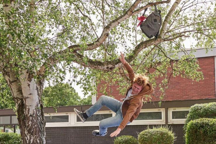 Außenseiter Kevin (Moritz Klaus) wurde von seinen Mitschülern mal wieder verarscht. Als er versucht seine Tasche vom Baum zu holen, stürzt er in den unter dem Baum parkenden Smart von Karin.