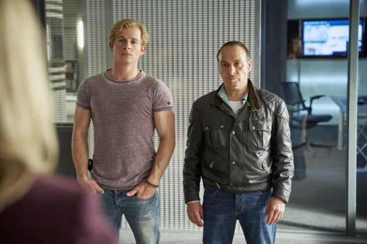 Paul (Daniel Roesner), Susanne (Daniela Wutte) und Semir (Erdogan Atalay, r.) vernehmen Torsten Schrader (Matthias Leja, l.), der den Polizisten jedoch versichert, dass seine Geschäfte legal und staatlich genehmigt sind.