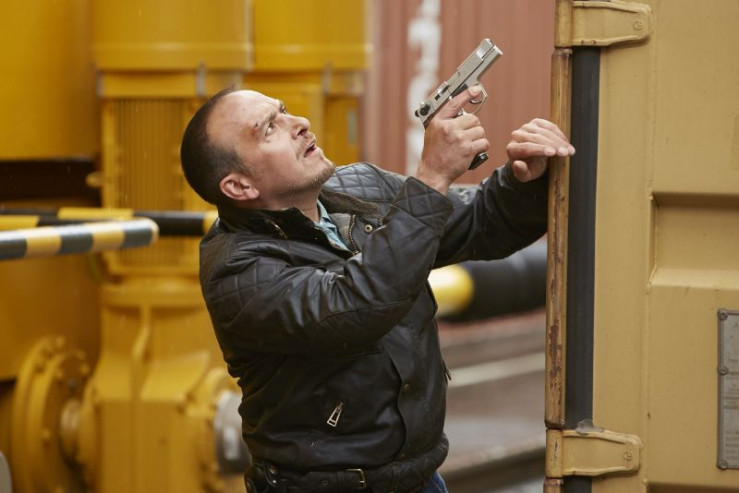 Semir (Erdogan Atalay) wird an einem Kabel den Verladekran hochgezogen und riskiert sein Leben, um Nina zu retten...