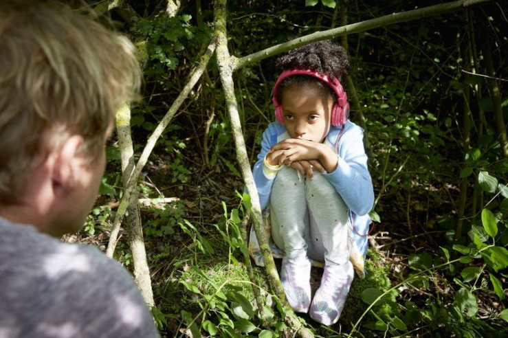 Paul (Daniel Roesner) findet im Wald das kleine Mädchen (Nomie Laine Tucker), apathisch auf die Musik aus ihren Kopfhörern lauschend.