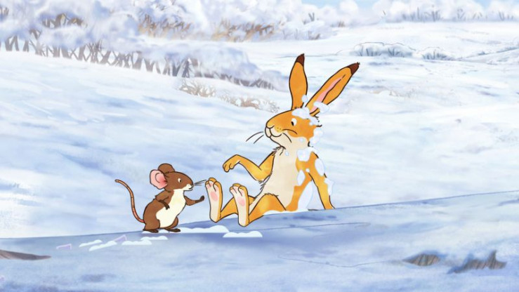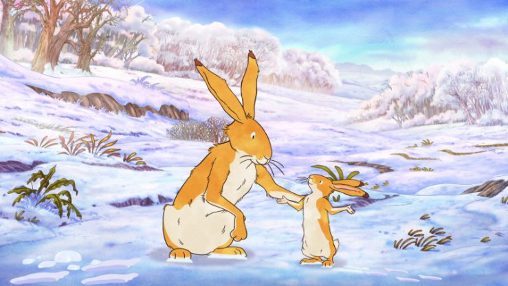 Der große braune Hase trägt den kleinen braunen Hasen im Huckepack durch die winterliche Landschaft.