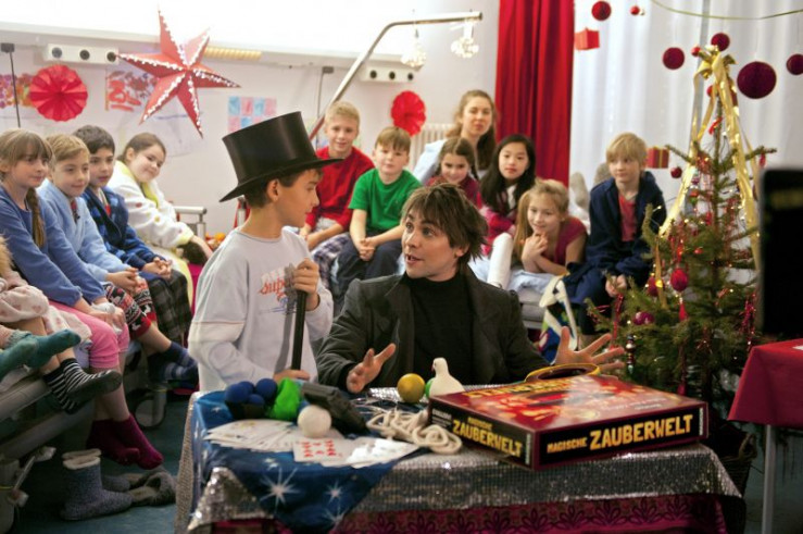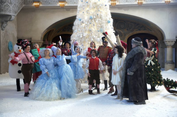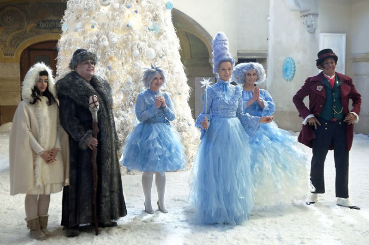 Bevor es losgeht, singen alle miteinander: (v.l.n.r.) Flöckchen (Gloria Endres de Oliveira), Väterchen Frost (Detlef Bierstedt), Rosabella (Anna Fischer), Rosalie (Ramona Krönke), Rosalba (Annette Strasser) und der Weihnachtsliedermacher (Milton Welsh).