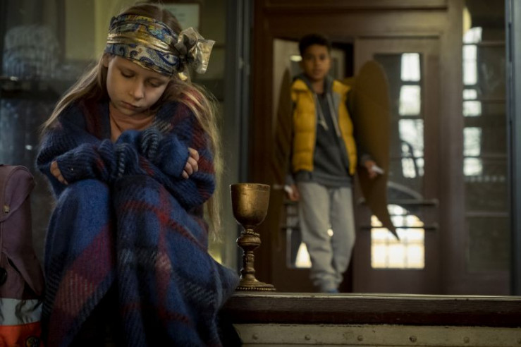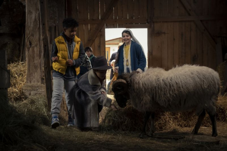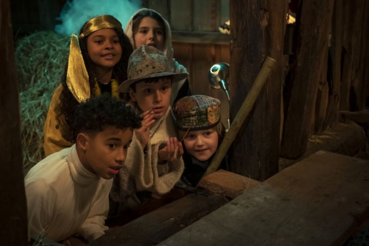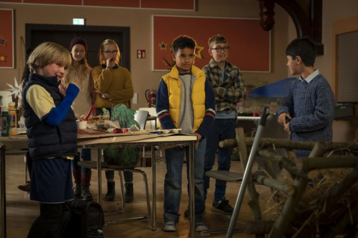 Die Kinder bei der Aufführung des Krippenspiels (v.l.: Paul (Sanusi Bah), Max (Camille Loup Moltzen), Sophie (Luiza Dandara Guimaraes), Sidra (Hannie Boon))