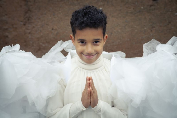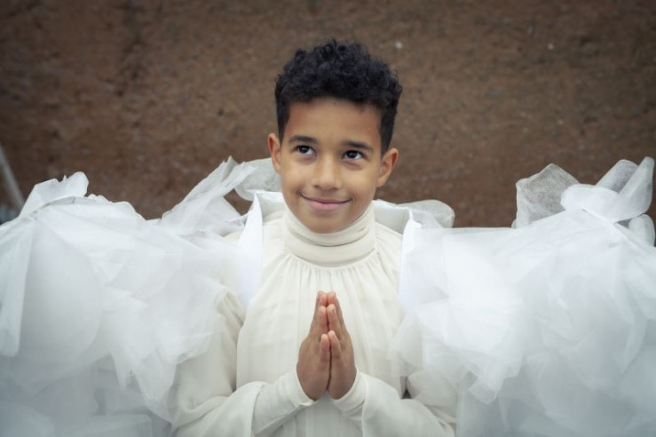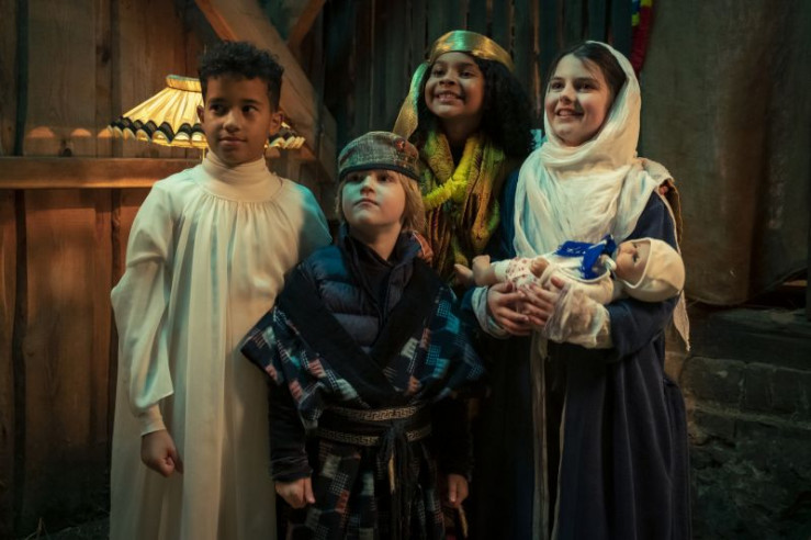 Die Kinder bei der Aufführung des Krippenspiels (Paule (Sanusi Bah, v.l.), Samuel (Andre Mueras Jimenez, M.), Sidra (Hannie Boon, h.), Sophie (Luiza Dandara Guimaraes, 2.v.l.), Max (Camille Loup Moltzen, r.))
