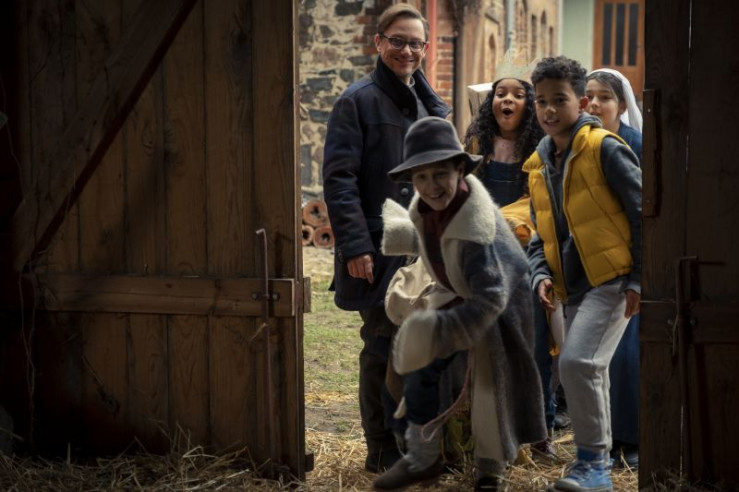 Der Pfarrer (Arndt Schwering-Sohnrey, l.) bietet den Kindern die Scheune für ihr Krippenspiel an. (Paul (Sanusi Bah, v.r.), Sidra (Hannie Boon, h.r.), Sophie (Luiza Dandara Guimaraes, M.))
