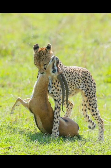 Geparde schleppen Beute möglichst schnell in Deckung, um nicht von Geiern entdeckt zu werden. Landende Geier sind von weitem zu erkennen und locken Hyänen und Löwen an.