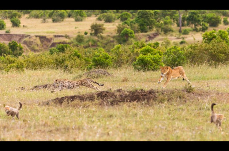Eine Löwin greift ein Gepardenweibchen und deren Junge an. Löwenangriffe sind die häufigste Todesursache für kleine Geparde.