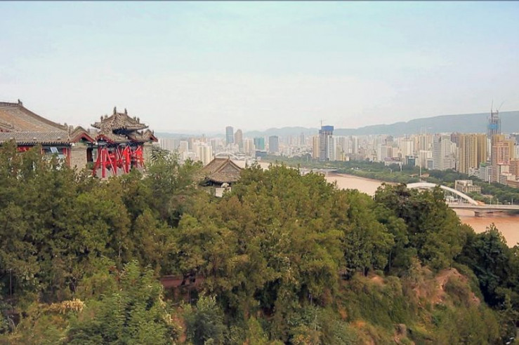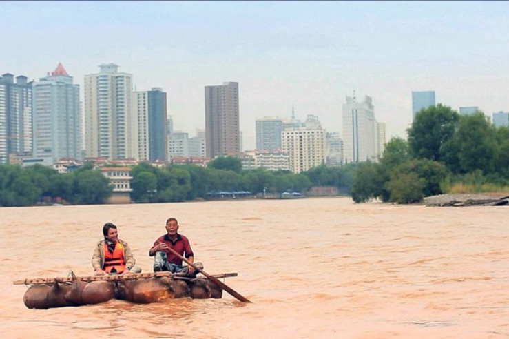 Moderator Alfred de Montesquiou (li.) auf dem Gelben Fluss, im Hintergrund die Skyline von Lanzhou: Die Stadt erstreckt sich über 30 Kilometer entlang des Flusses, der Lebensader Nordchinas.