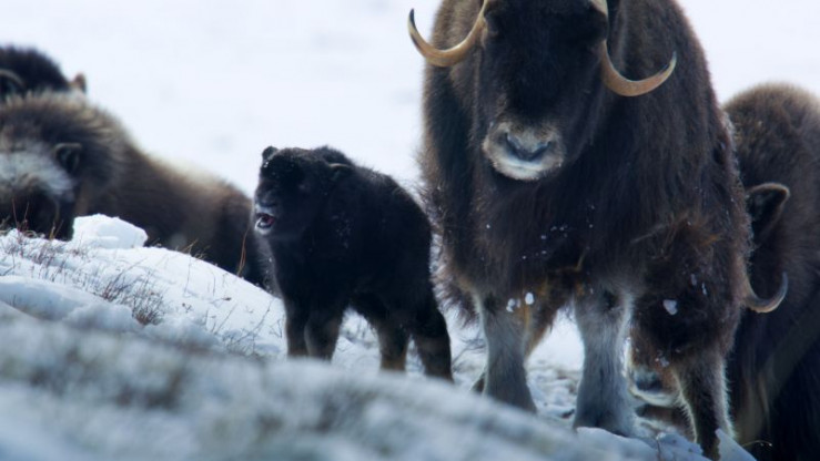 Ein Moschusochsenbaby steht dicht bei seiner Mutter in der arktischen Tundra.