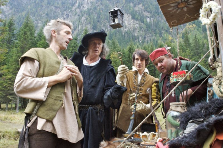Der König (Sebastian Fischer, 2.v.r.) und sein Minister (Erich Schleyer, 2.v.l.) bestaunen den Trödel von Hinz (Andreas Schmidt, l.) und Kunz (Sven Pippig, r.).