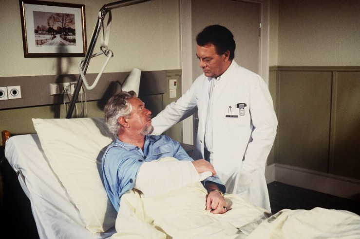 Der Patient Willi Anschütz (Klaus Havenstein, l.) soll am Blinddarm operiert werden. Aber je näher der Termin rückt, desto mulmiger wird ihm ums Herz. Sein Horoskop empfiehlt ihm, kein Risiko einzugehen. Prof. Brinkmann (Klausjürgen Wussow) versucht ihn zu überzeugen, dass er die Operation dringend benötigt.
