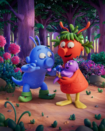 "Die Schnetts und die Schmoos": Bernd (l.)und Grete (r.) sind glücklich über ihr lilafarbenes Baby.