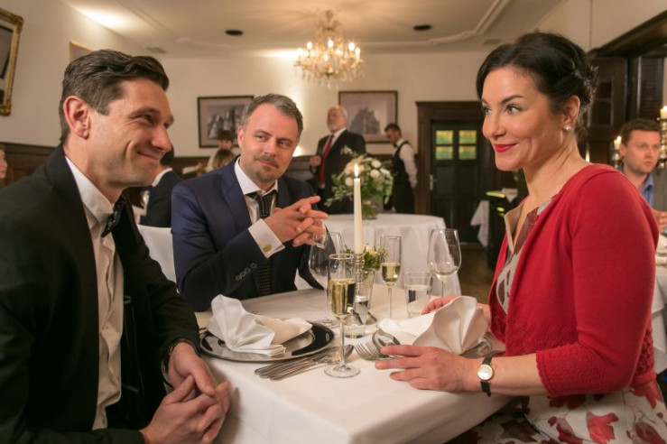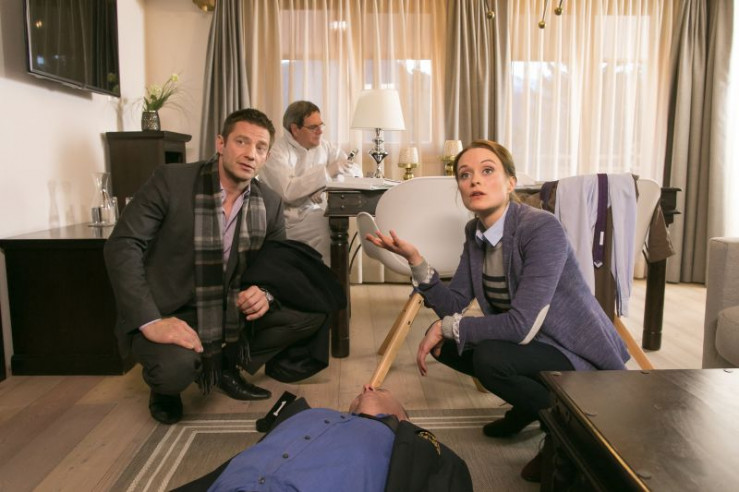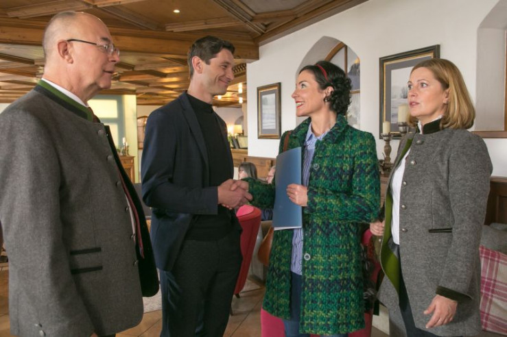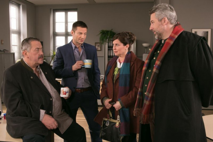 Während das Ehepaar Anton (Dieter Fischer, r.) und Hilde Stadler (Isabel Mergl, 2.v.r.) Urlaub im Hotel Bergkamm macht, ermitteln Hansen (Igor Jeftic, l.) und Mohr (Max Müller, 2.v.l.) im aktuellen Mordfall.