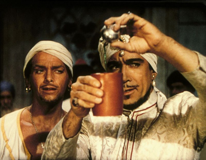 Der kühne Seefahrer Sindbad gelangt in den Besitz einer Karte, auf welcher der Seeweg zu einer geheimnisvollen Schatzinsel verzeichnet ist. Unterwegs verliebt er sich in die schöne Abenteurerin Shireen . Doch die beiden werden von dem habgierigen Emir von Daibul und dem verräterischen Mongolen Melik verfolgt. - Prachtvoll-exotisch ausgestattetes Abenteuermärchen.