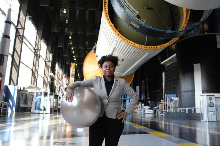 Die NASA-Ingenieurin Tiera Fletcher vor einer modernen Rakete.
