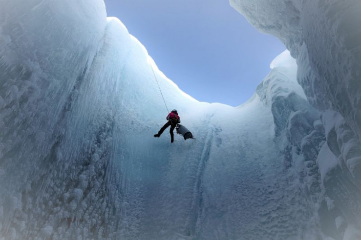 Weltrekord: Fast 180 Meter tief steigt Glaziologe Prof. Alun Hubbard in eine Gletschermühle im Grönländischen Inlandeis hinab, um Untersuchungen vorzunehmen.