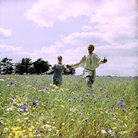 Wassja (Alexej Katyschew, re.) besteht alle Prüfungen aus Feuer, Wasser und Posaunen und befreit seine Freundin Aljonuschka (Natalja Sedych, li.) aus den Fängen des bösen Zauberers Kastschej. Glücklich laufen beide über blühende Wiesen und necken übermütig die Ziege "Weißchen".