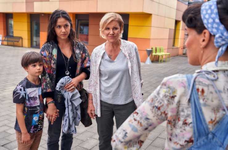 Klara (Mariele Millowitsch, 2. v. re.) bittet Danni (Jutta Dolle, re.) darum, Roberts (Sammy Schrein, li.) Mutter Eda (Soma Pysall, 2. v. li.) einzustellen.