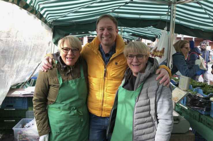 Tobias Kämmerer mit Tomaten-Heidi (li.) und ihre Schwester (Gärtnerei Jung) auf dem Offenbacher Wochenmarkt.