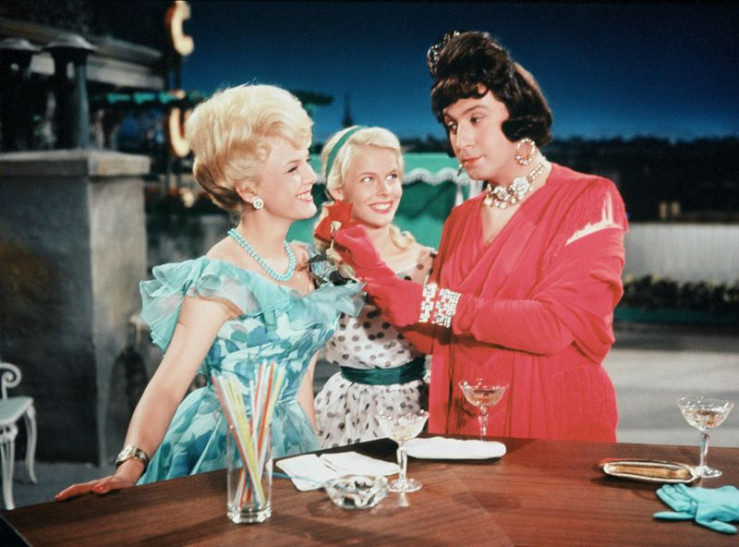 Ulla Bergström (Eike Pulwer, li.) und ihre Cousine Britta (Marlene Rahn, Mitte) finden Charleys Tante sehr amüsant. Noch ahnen sie nicht, dass sich hinter der angeblichen Tante (Peter Alexander) ein junger Mann verbirgt.