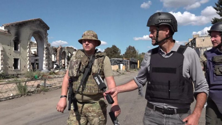 An der Frontlinie spricht Steffen Schwarzkopf mit einem ukrainischen Soldaten über die Lage im Kriegsgebiet - die Spuren der Gefechte sind überall sichtbar.