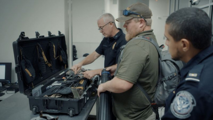 Die Sicherheitsbeamten holen einen Mann, der seit 10 Jahren flüchtig ist, in San Francisco ab. Er wurde von Special Agents aus China zurückgeführt.
