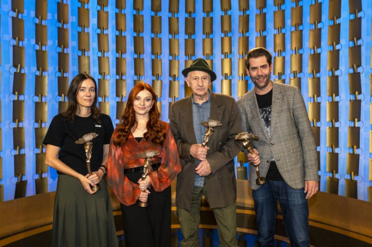 Die diesjährigen Preisträgerinnen und Preisträger. Von links: Toxische Pommes (Creator-Preis), Lara Ermer (Senkrechtstarter-Preis), Georg Ringsgwandl (Ehrenpreis) und Claus von Wagner (Hauptpreis).