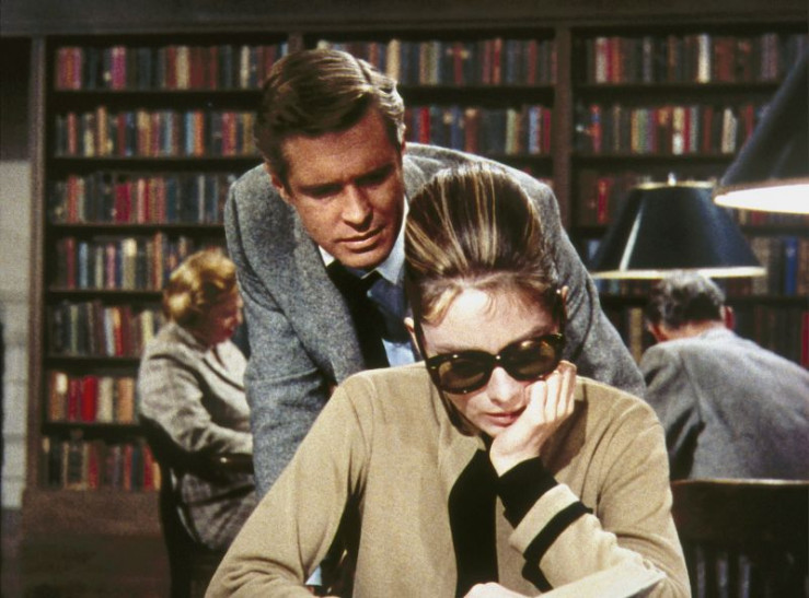 Der verkrachte Schriftsteller Paul Varjak (George Peppard) besucht Holly Golightly (Audrey Hepburn) in der Stadtbibliothek, wo sie sich über das Land ihres künftigen Millionärsgatten informiert.