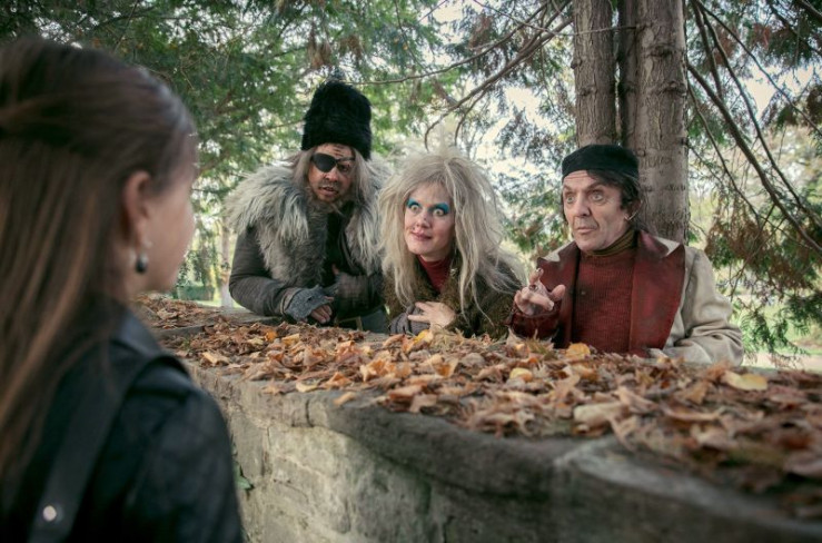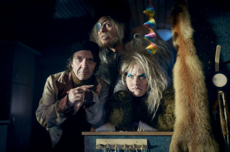 Die drei abgehalfterten Geisterbahnfiguren der Neuauflage von "Spuk unterm Riesenrad" (2024): Hexe (Anna Schudt), Riese (Moritz Führmann) und Rumpelstilzchen (David Bennent).
