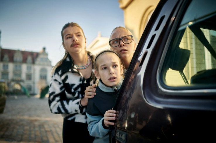 Tammi (Elisabeth Bellé), Umbo (Noèl Gabriel Kipp) und Keks (Lale Andrä) verfolgen die Geister durch die Bernburger Innenstadt