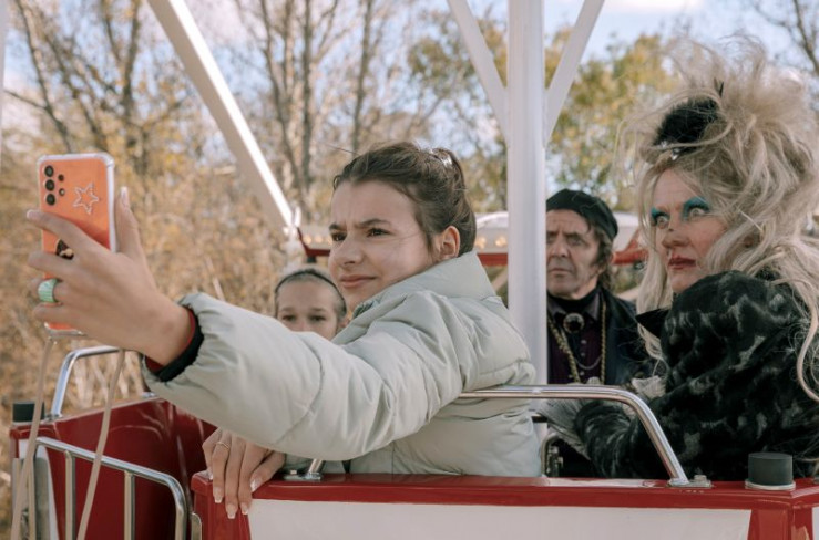 Tammi (Elisabeth Bellé) und Umbo (Noèl Gabriel Kipp) sitzen mit den lebendig gewordenen Figuren aus der Geisterbahn im Riesenrad. Hexe (Anna Schudt) Rumpelstilzchen (David Bennent).