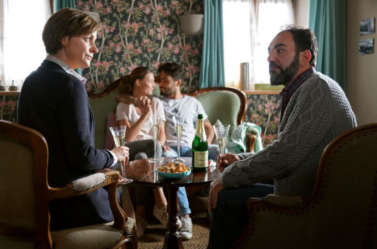 Familientreffen bei Toni (Adnan Maral, re.), Anne (Jule Ronstedt, li.) und Franzi (Lena Meckel, stehend): Mesut (Orhan Güner) und Farah (Siir Eloglu), die Eltern von Osman (Aram Arami), stellen sich vor.