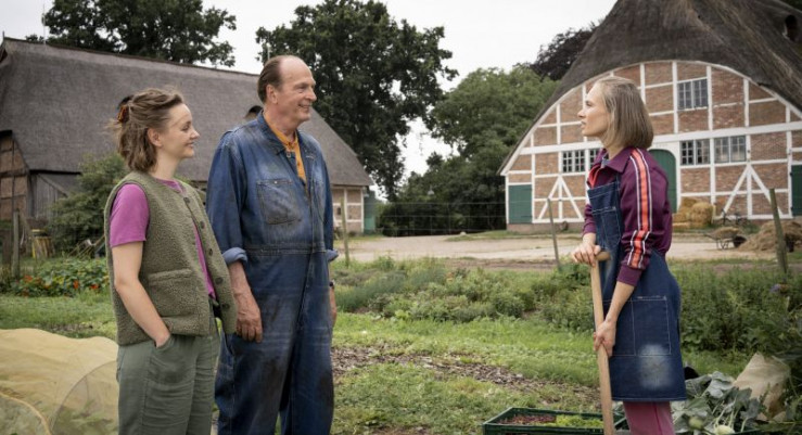 Charlie Runge (Mathilde Bundschuh, li.) und Markus Gellert (Herbert Knaup) freut es: Selbst die gestresste Berlinerin Bea Gebhard (Alina Levshin, re.) hat Spaß an der Arbeit auf dem Bauernhof, mit der Gellert (Herbert Knaup, Mitte) nur zu gut vertraut ist.